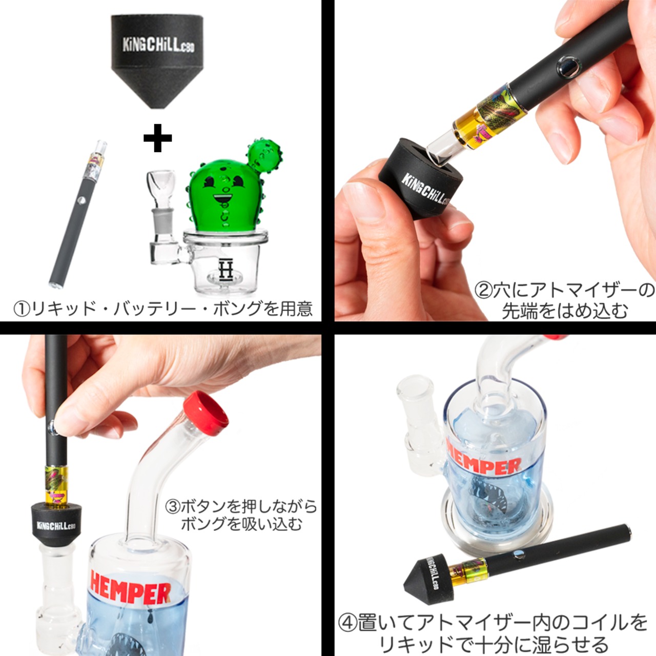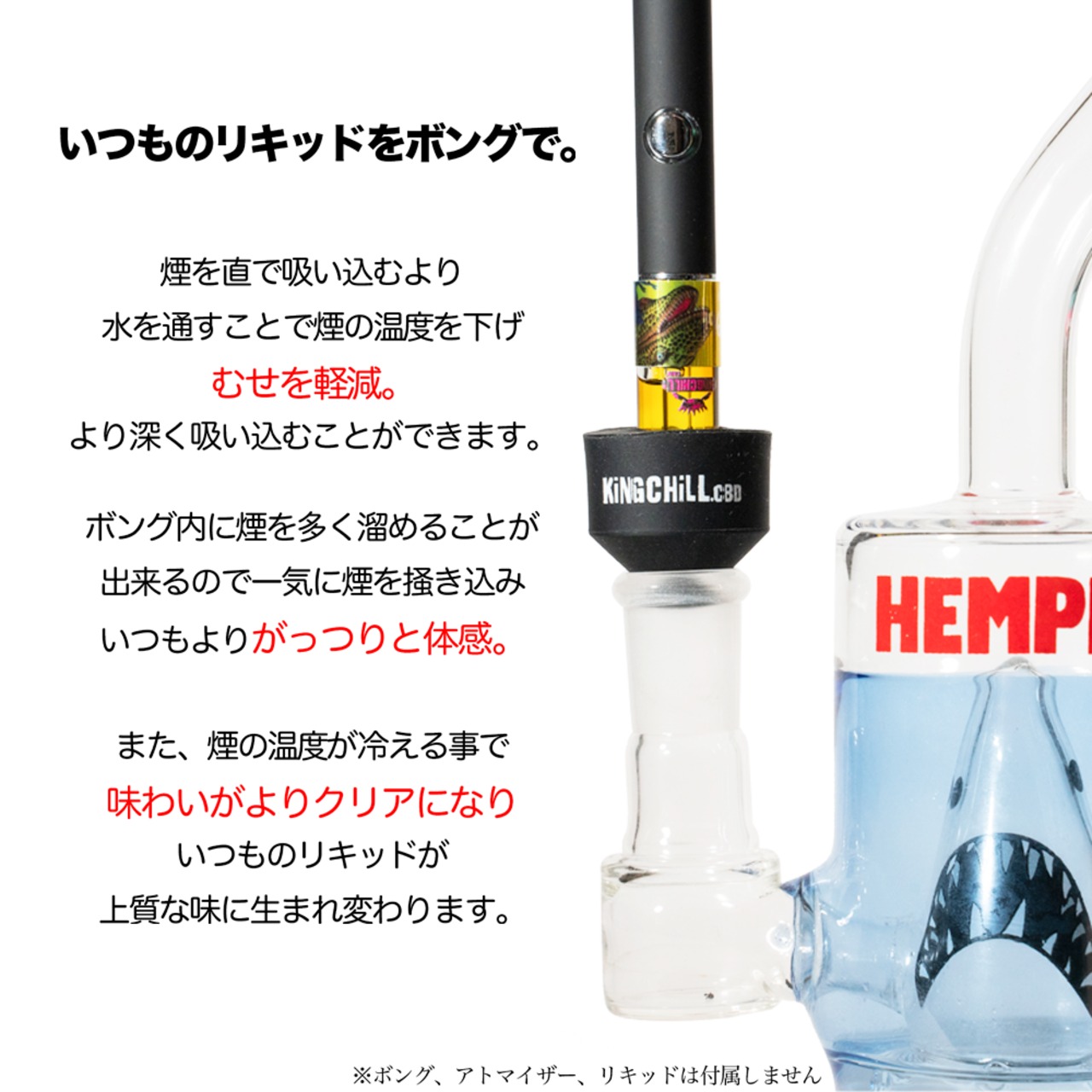 このボングアダプターはKiNGCHiLL.CBDで発売されている『爆感シリーズ』アトマイザーにはサイズが小さく適合しません。当社で取扱う通常のアトマイザー他社ブランドのアトマイザー規格(太さ10mmの吸口・510スレッド)には問題なく適合します。